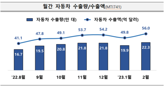 2022년 2월 대비, 2023년 2월 자동차 산업은 생산 30.2%, 내수 19.6%, 수출은 34.8% 늘었습니다. 수출 금액으로 따지면 거의 두 배 가까이(+47.1%) 뛰었습니다.