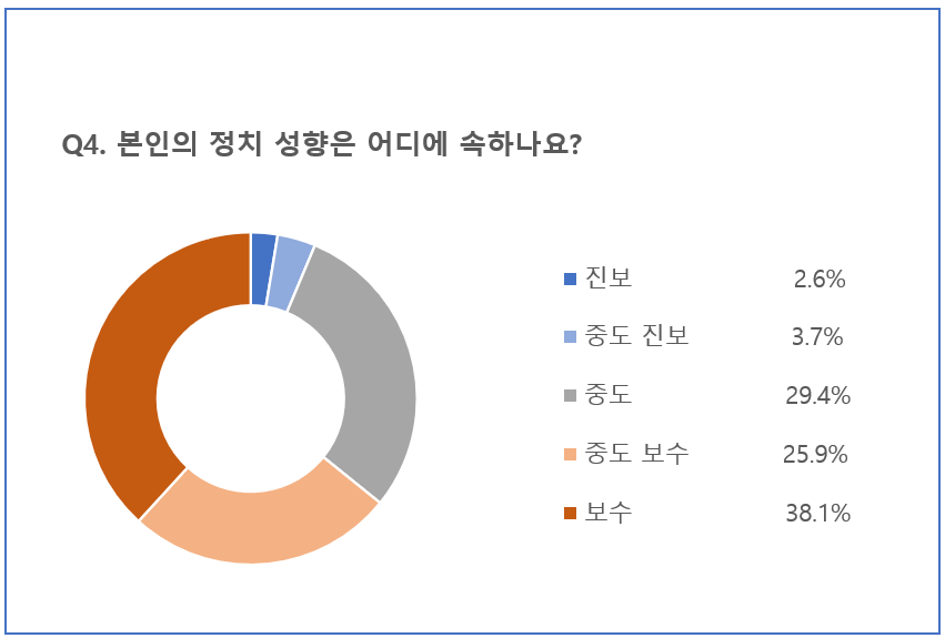 마지막으로 정치 성향을 묻는 질문에는 보수38.1%로 가장 많은 것으로 나타났습니다. 뒤이어 중도’(29.4%), ‘중도 보수’(25.9%), ‘중도 진보’(3.7%), ‘진보’(2.6%) 순으로 집계됐습니다.
