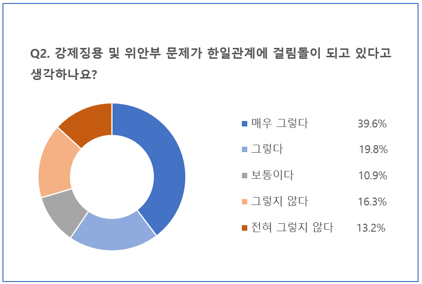 두번째로 강제징용 및 위안부 문제가 한일관계에 걸림돌이 되고 있는지를 물은 질문에 매우 지지한다39.6%로 가장 많은 비중을 차지했습니다. 이어 그렇다’(19.8%), ‘그렇지 않다’(16.3%), ‘전혀 그렇지 않다’(13.2%), ‘보통이다’(10.9%) 순이었습니다.