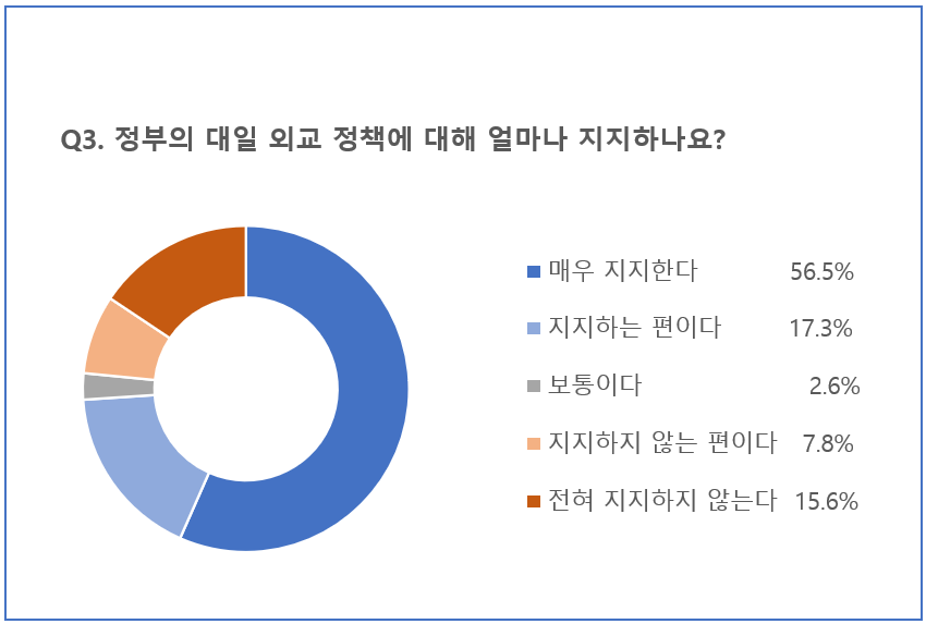 세번째 질문인 정부의 대일 외교 정책을 얼마나 지지하나요라는 질문에도 매우 지지한다56.5%로 가장 많았고, ‘지지하는 편이다’(17.3%), ‘전혀 지지하지 않는다’(15.6%), ‘지지하지 않는 편이다’(7.8%), ‘보통이다’(2.6%)가 뒤를 이었습니다.