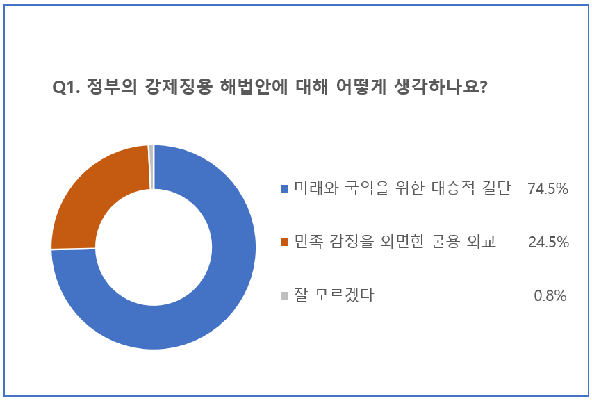먼저 정부의 강제징용 해법안에 대해 어떻게 생각하나요?’라는 질문에 참여자 74.5%미래와 국익을 위한 대승적 결단이다라고 답했습니다.