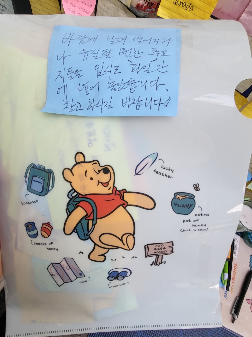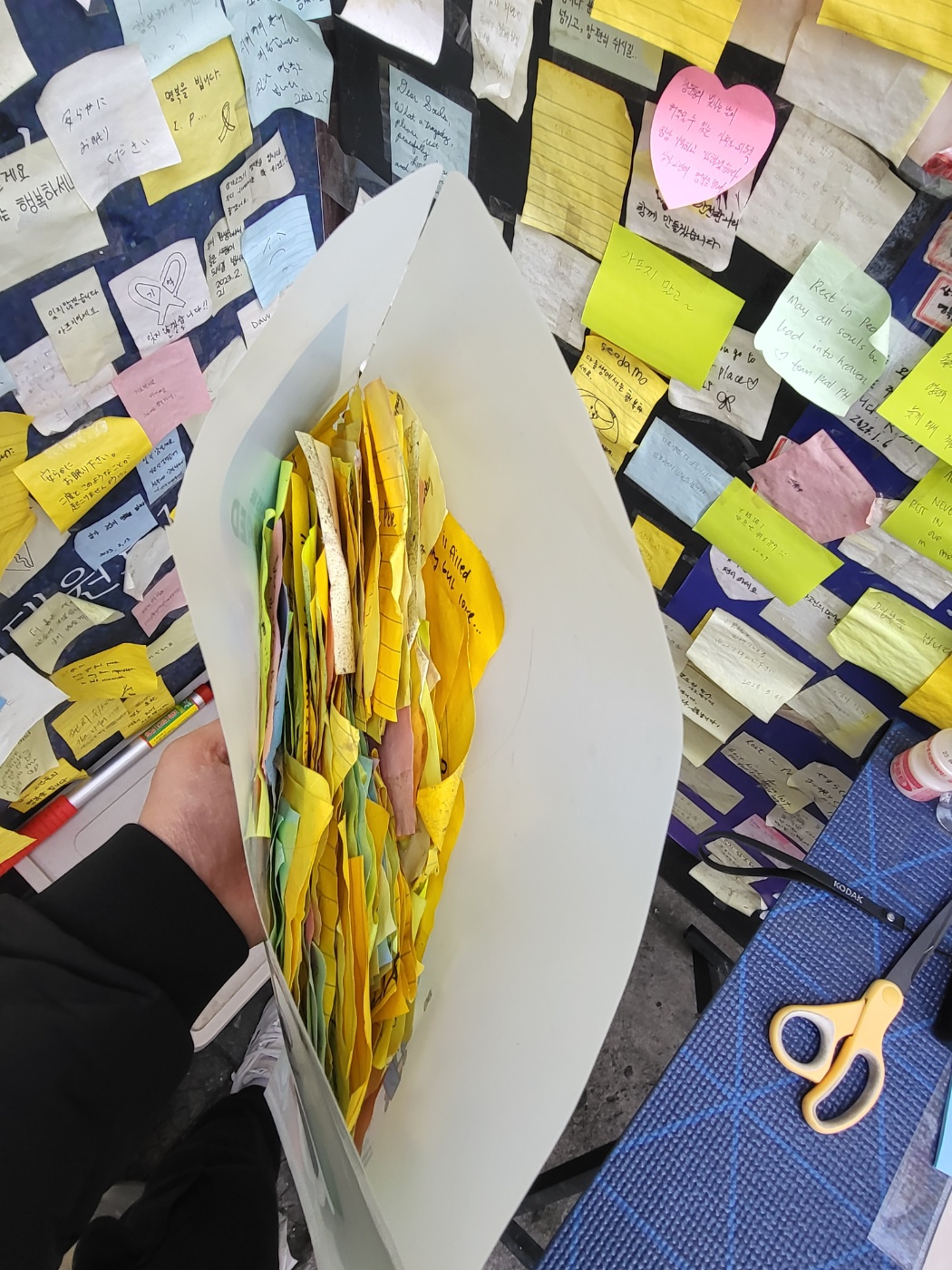 떨어진 포스트잇을 담은 파일철에 '바람에 날려 유실될 뻔한 추모지들을 임시로 파일 안에 넣어놨습니다. 참고하시길 바랍니다'라는 문구가 써져있다. 출처=위즈경제