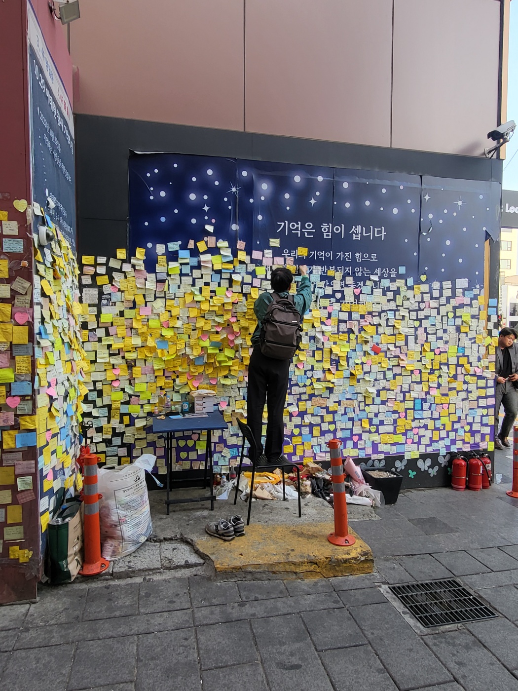 [위즈경제] 류으뜸 기자 =한 남성이 10일 서울 이태원역 1번 출구 앞 추모공간에서 떨어진 포스트잇을 테이프로 붙이고 있습니다.