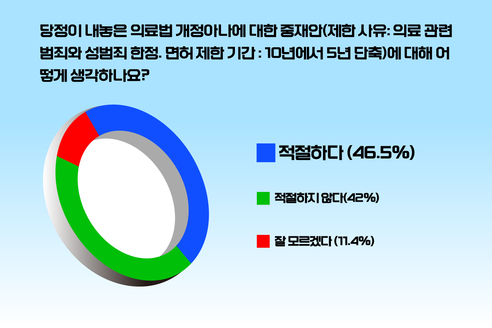 마지막으로 ‘당정이 내놓은 의료법 개정안에 대한 중재안(제한 사유: 의료 관련 범죄와 성범죄 한정. 면허 제한 기간 : 10년에서 5년으로 단축)에 대해 어떻게 생각하나요?라는 질문에는 ‘적절하다’가 46.5%를 기록했습니다. ‘적절하지 않다’는 42%, ‘잘 모르겠다’는 11%로 각각 집계됐습니다.