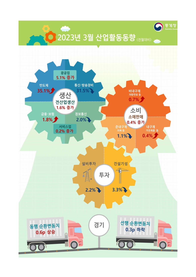 통계청이 발표한 2023년 3월 산업활동동향에 따르면, 전산업생산이 전월대비 1.6%, 소매판매가 0.4% 증가하는 등의 긍정적인 신호가 나타났습니다.