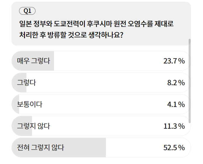 “일본의 후쿠시마 원전 오염수 방류에 한국 정부가 잘 대응하고 있다고 생각하나요?”란 질문엔 참여자의 63.9%가 ‘그렇지 않다’고 이야기했으며, “후쿠시마 원자력 발전소 오염수 방류가 일본 지역은 물론 국내 수산물 안전과 품질에 영향을 미칠 것이라 생각하나요?”라고 묻자 60.8%의 참여자가 “매우 그렇다”고 답한 바 있습니다.