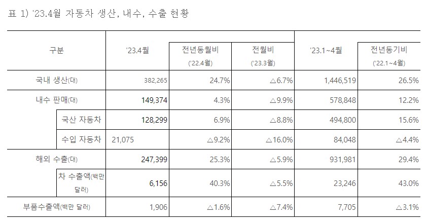 한국GM, KG모빌리티의 4월 수출 증가율은 각각 115.9%, 30.7%로 나타났습니다. 다만 르노코리아는 56.8% 감소했습니다. 전기차 등 친환경차 수출은 3개월 연속 20억달러를 돌파하며 자동차 수출 호조세를 견인했습니다.