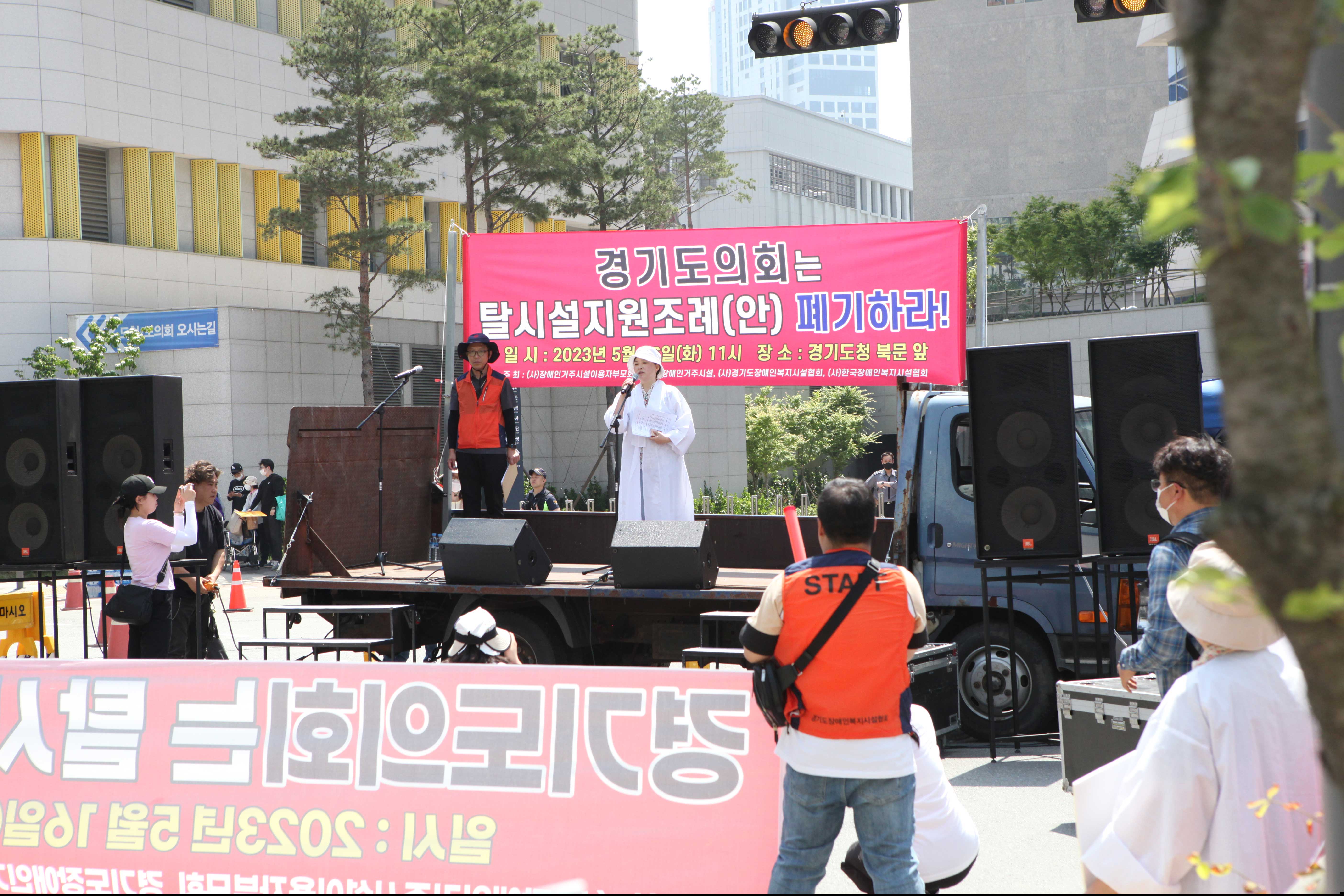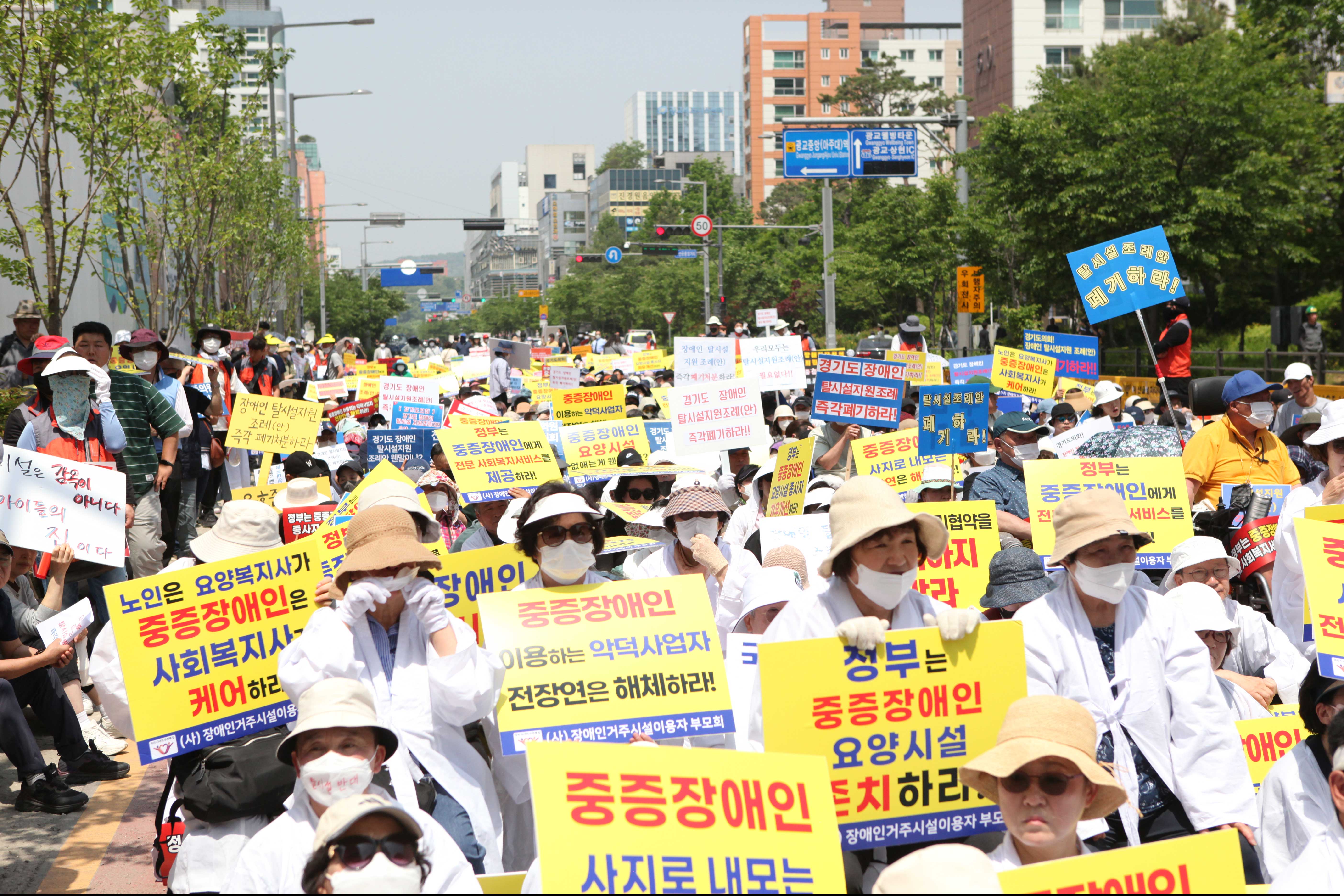 16일 오전 11시경, 경기도청 북문 앞에는 한국장애인복지시설협회 등 시설단체 및 장애인거주시설이용자부모회가 집회를 열고 경기도의회를 향해 "경기도 탈시설 지원 조례를 폐기하라"고 요구했습니다. 이날 집회에는 장애인 및 보호자 1000여명(주최측 추산)이 모였습니다.경기도 탈시설 조례안은 장애인시설에서 나와 지역사회에 거주하는 장애인에게 탈시설에 따른 공공임대주택, 자립정착금, 활동지원급여, 공공일자리, 장애수당 등을 지원하는 내용을 골자로 합니다.