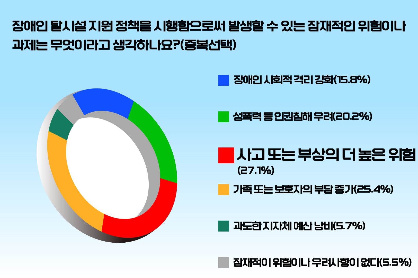 세번째로 ‘장애인 탈시설 지원 정책을 시행함으로써 발생할 수 있는 잠재적인 위험이나 과제는 무엇이라고 생각하나요’라는 질문에 ‘사고 또는 부상의 위험’이 27.1%로 가장 많은 비율을 차지했습니다. 이어 ‘가족 또는 보호자의 부담 증가’ 25.4%, ‘성폭력 등 인권침해 우려’ 20.2%, ‘장애인 사회적 격리 강화’ 15.8%, ‘과도한 지자체 예산 낭비’ 5.7%, ‘잠재적인 위험이나 우려사항이 없다’ 5.5% 순으로 집계됐습니다.