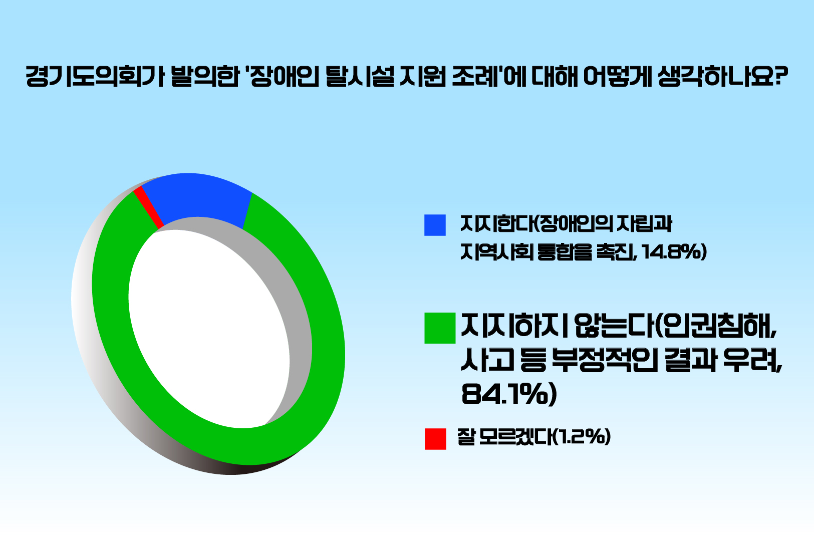 [위즈경제] 이정원 기자 =위즈경제 폴앤폭에서 “’경기도 장애인 탈시설 지원 조례안’ 찬반 논쟁”이라는 주제로 투표를 진행한 결과, 참여자 84.1%가 경기도의회가 탈시설 지원 조례를 제정하는 것에 반대하고 있는 것으로 나타났습니다. 이번 조사는 지난 4월 27일부터 5월 22일까지 진행했으며, 총 612명이 참여했습니다.