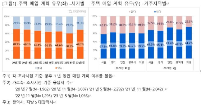 거주지역별로는 지방(74.7%) > 인천(73.4%) > 지방 5대 광역시(68.5%) > 서울(67.5%) > 경기(65.4%) 순으로 매입 의사 응답 비율이 높게 나타났습니다. 지난해 11월 조사 결과와 비교하면 모든 지역에서 매입 의사가 높아졌습니다.