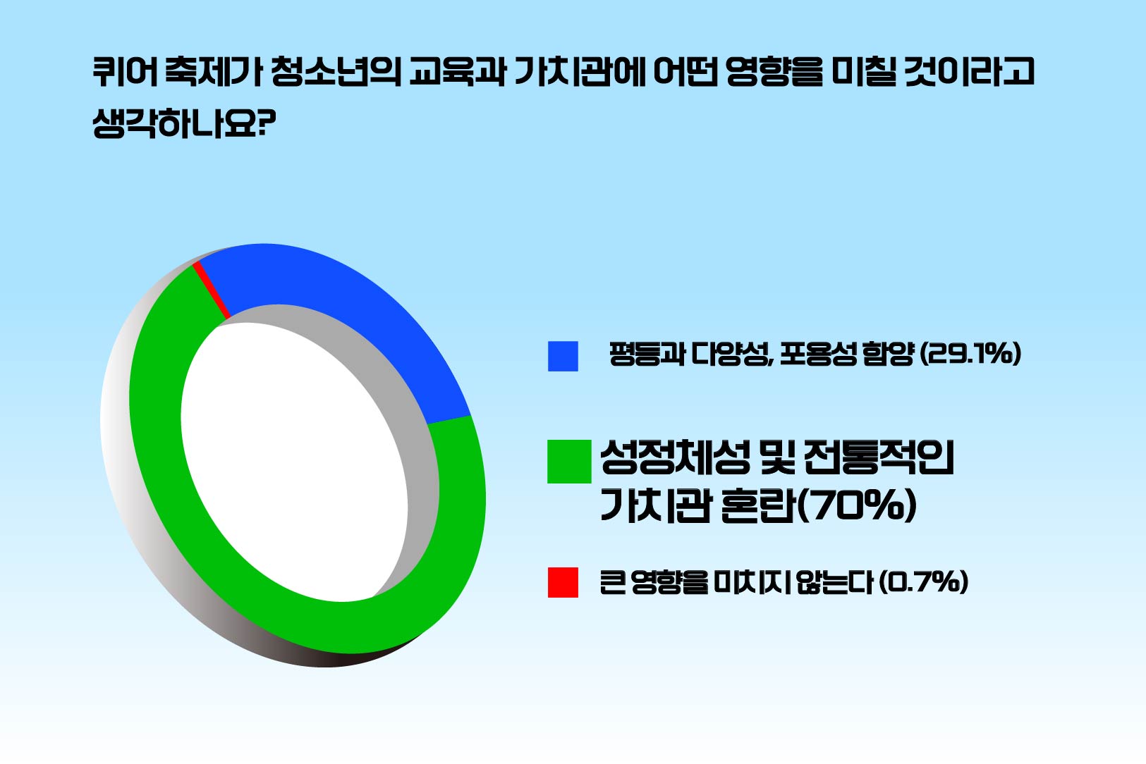 세번째로 ‘퀴어 축제가 청소년의 교육과 가치관에 어떤 영향을 미칠 것이라고 생각하나요?'라는 질문에는 '성정체성 및 전통적인 가치관 혼란'을 불러온다는 응답자가 70%, '평등과 다양성, 포용성 함양'이 29.1%, '큰 영향을 미치지 않는다'는 0.7%를 기록했습니다.