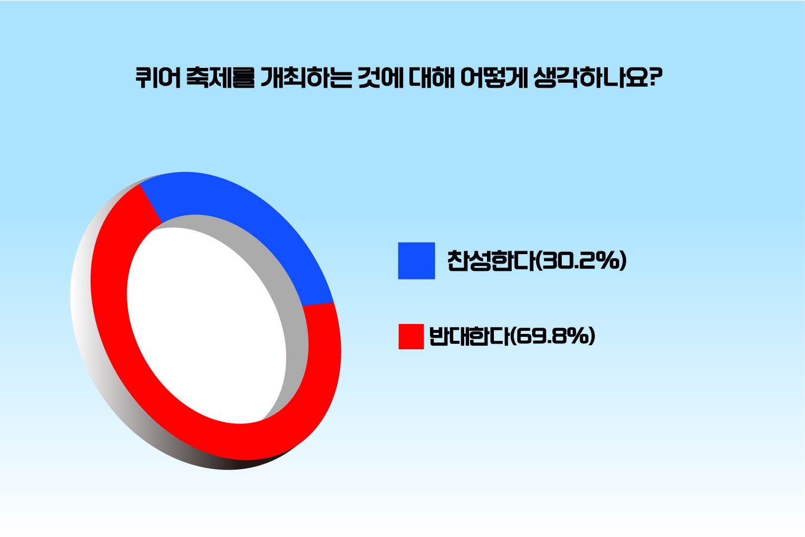 먼저 '퀴어 축제를 개최하는 것에 대해 어떻게 생각하나요?'라는 질문에는 '반대한다'고 응답한 비율이 69.8%를 차지했습니다. 반면 '찬성한다'는 30.2%로 집계됐습니다.