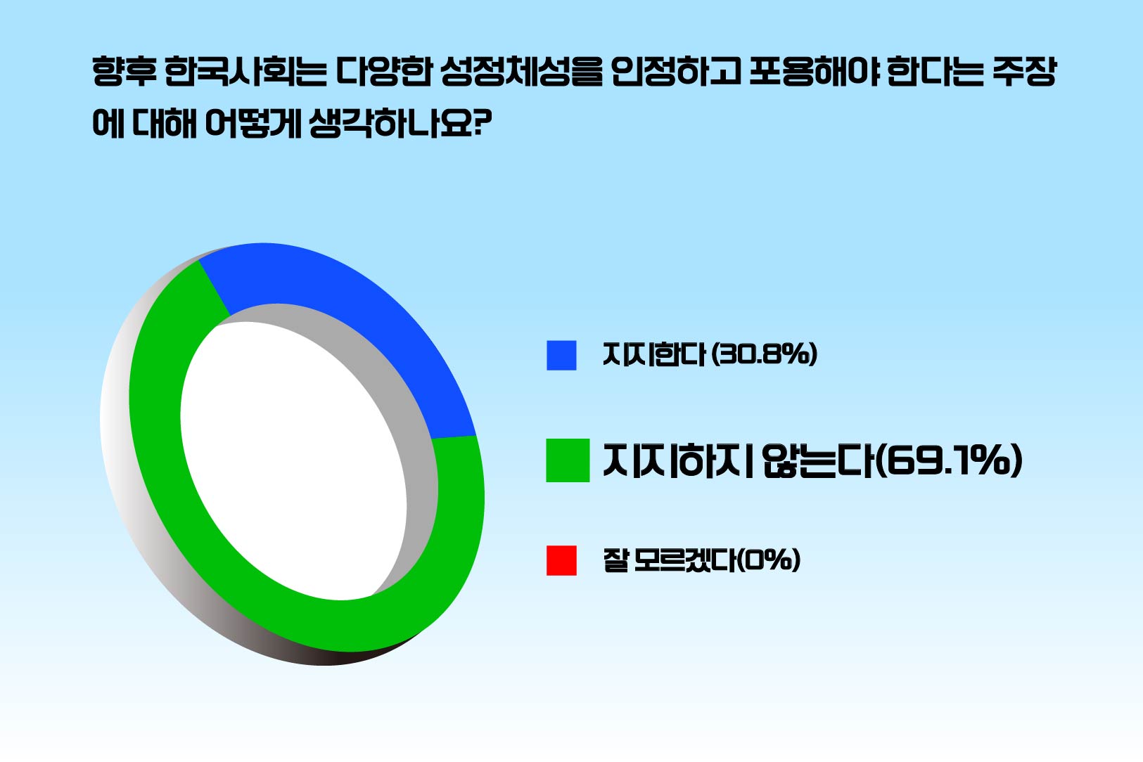 마지막으로 '향후 한국사회는 다양한 성정체성을 인정하고 포용해야 한다는 주장에 대해서 어떻게 생각하나요?'라는 질문에는 69.1%가 '지지하지 않는다'고 응답했습니다. 반면 '지지한다'는 30.8%를 차지했습니다.