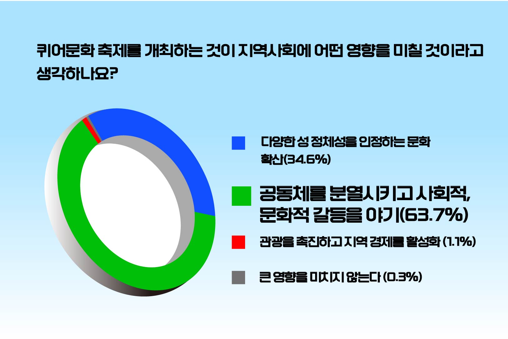 두번째로 '퀴어 축제를 개회하는 것이 지역사회에 어떤 영향을 미칠 것이라고 생각하나요?'라는 질문에는 63.7%가 '공동체를 분열시키고 사회적, 문화적 갈등을 야기'한다고 답했습니다. 이어 '다양한 성 정체성을 인정하는 문화 확산'(34.6%),'관광을 촉진하고 지역 경제를 활성화(1.1%), 큰 영향을 미치지 않는다(0.3%) 순이었습니다.