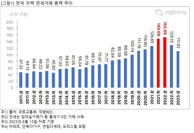 부동산 정보 서비스 업체 직방이 전세계약 기간을 2년으로 간주해 국토교통부 자료를 분석한 결과, 올해 하반기와 내년 상반기 계약이 만료되는 전국 주택 전세거래 총액은 302조1700억원인 것으로 집계됐습니다. 올해 하반기 계약이 만료되는 금액이 149조800억원, 내년 상반기 만료 예정 금액은 153조900억원입니다.