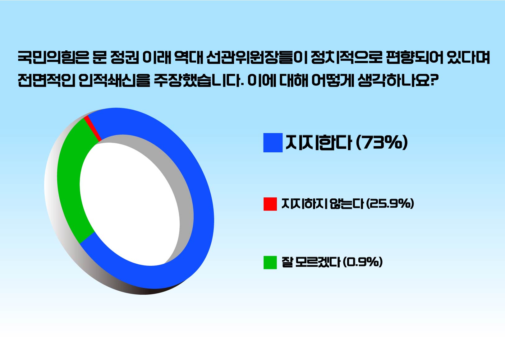 편향되어 있다며 전면적인 인적 쇄신을 주장했습니다. 이에 대해 어떻게 생각하나요?’라고 물었습니다. 이에 참여자의 73%는