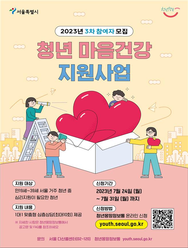 한편, 서울시는 24일 오전 10시부터 오는 31일 17시까지 ‘청년 마음 건강 지원사업’의 3차 참여자를 추가 모집합니다.