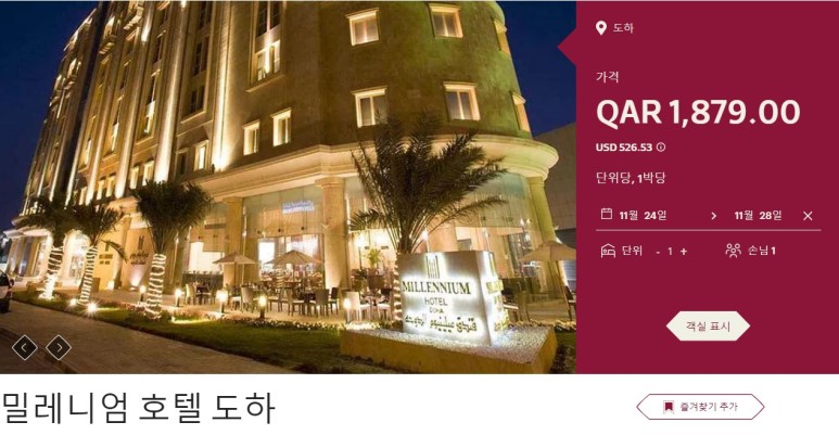 1개씩 찾을 수 있었습니다. 먼저 카타르 당국에서 제공하는 숙박사이트에서 최고가 숙소가