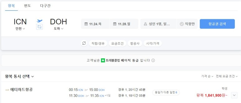 에티하드 항공으로 가격은 왕복 총 184만원입니다. 인천에서 00시 15분에 출발해 도하에 15시에