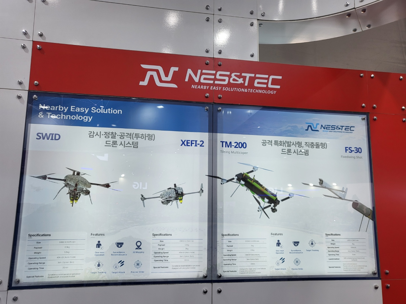 이번 전시회에 네스앤텍이 전시한 멀티콥터 형태의 다목적 드론인 ‘SWID(경계용드론)’와 ‘XeFi2(근거리정찰드론)’는 통합된 지상 통제장비로 1인 운용이 가능합니다.