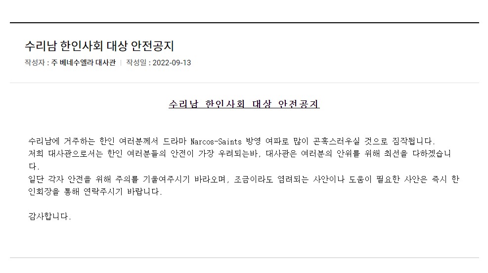 주베네수엘라 대사관은 지난 13일 안전공지를 통해 "수리남에 거주하는 한인 여러분이 드라마 '수리남' 방영 여파로 많이 곤혹스러우실 것으로 예상된다"면서 "대사관은 여러분의 안위를 위해 최선을 다하겠습니다"고