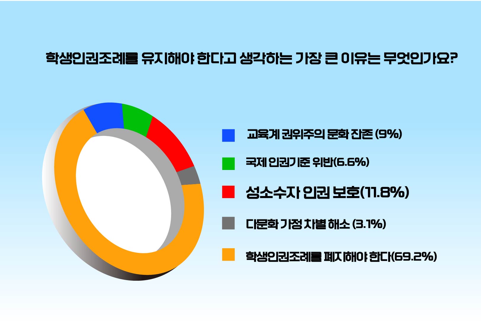 마지막으로 '학생인권조례를 유지해야 한다고 생각하는 가장 큰 이유는 무엇인가요?'라는 질문에는 '성소수자 인권보호'가 11.8%를 차지했습니다. 이어 '학생인권조례를 폐지해야 한다'(69.2%),'국제 인권기준 위반'(6.6%), '교육계 권주의 문화 잔존'(9%), '다문화 가정 차별 해소'(3.1%) 순입니다.