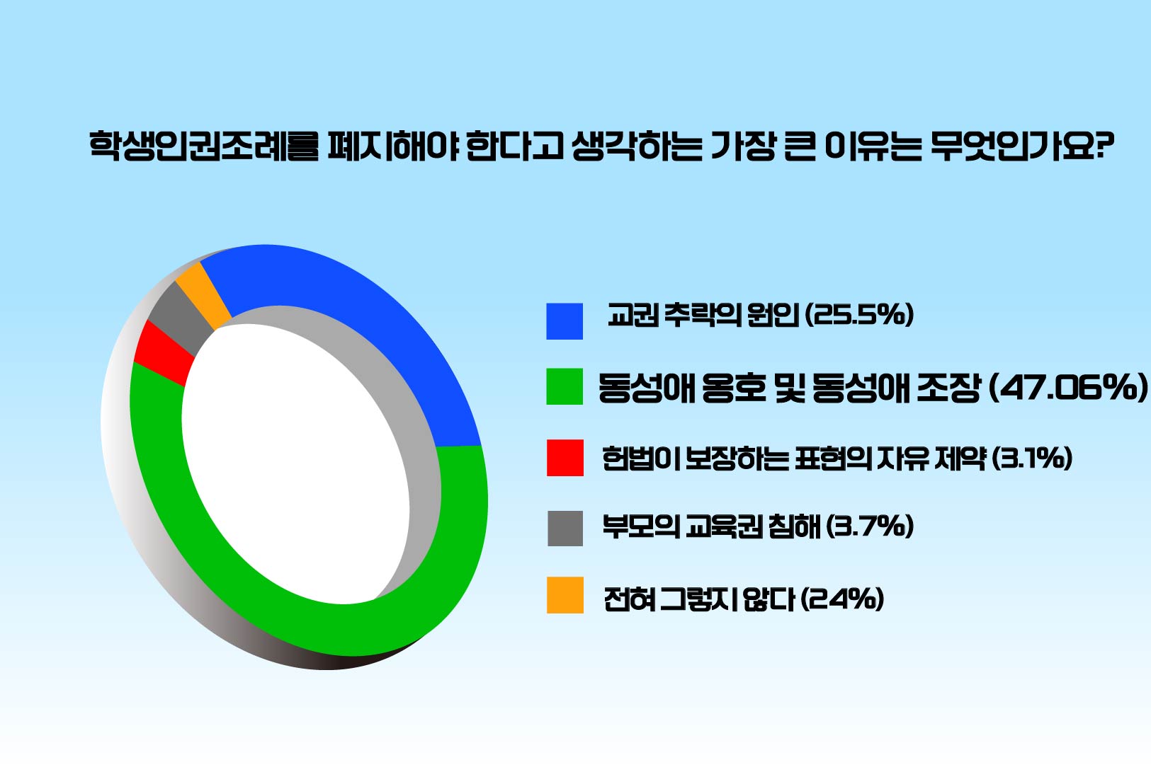 이어 '학생인권조례를 폐지해야 한다고 생각하는 가장 큰 이유는 무엇인가요?'라는 질문에는 '동성애 옹호 및 동성애 조장'이라고 응답한 참여자가 43.6%를 차지했습니다. 이어 '교권 추락의 원인'(25.5%), '부모님 교육권 침해'(3.7%), '헌법이 보장하는 표현의 자유 제약'(3.1%) 순입니다.