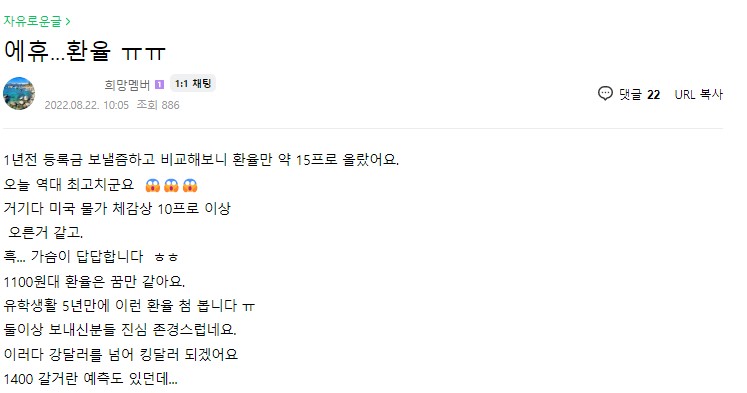 미국 유학생 관련 커뮤니티에는 환율 상승으로 인한 비용 부담을 걱정하는 글들이 올라오고 있습니다.