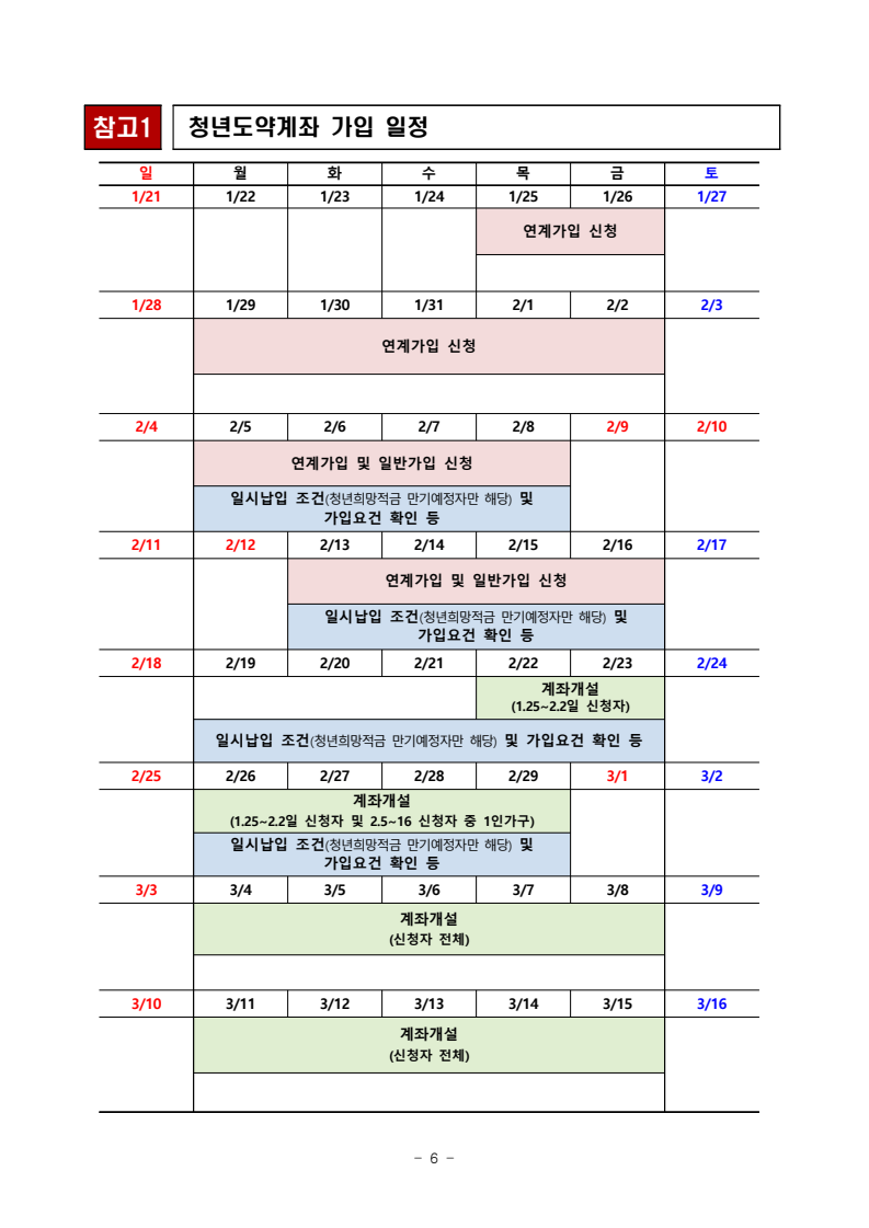 청년도약계좌는 2월 중, 청년희망적금 만기예정자가 연계해서 가입할 수 있는 건 물론, 일반 청년의 가입도 가능합니다. 일반 청년은 2월 5일부터 2월 16일까지 청년도약계좌 가입을 신청할 수 있으며, 가입이 되면 1인 가구는 2월 26일~3월 15일, 2인 이상 가구는 3월 4일~3월 15일 사이에 계좌를 개설할 수 있습니다.