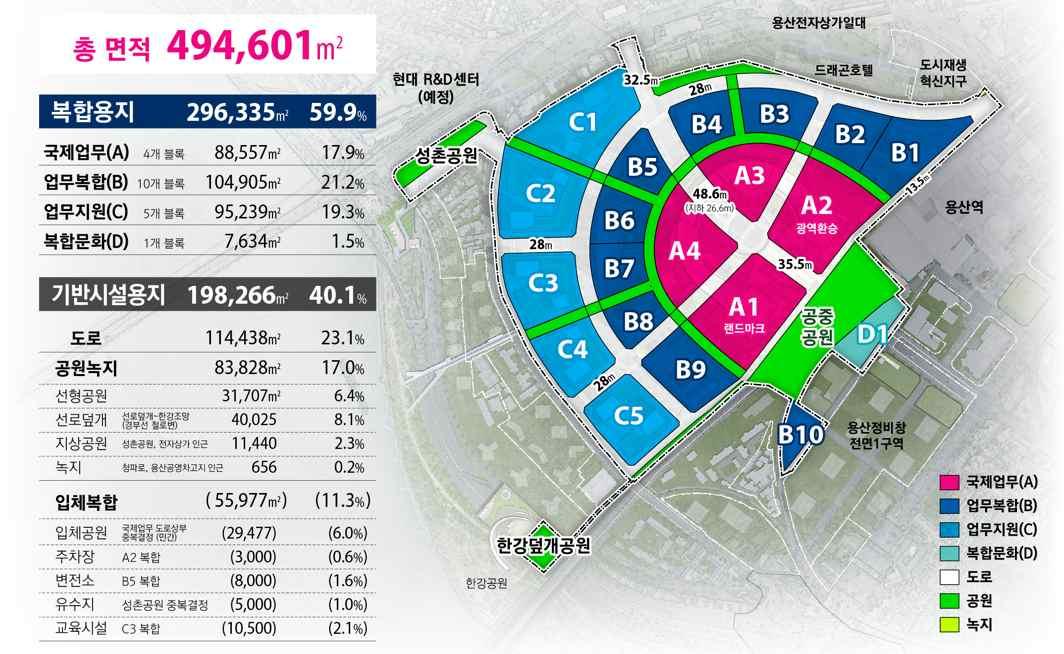 가장 넓은 면적을 차지하는 ‘업무복합존’의 경우, 용산전자상가와 현대 R&D 센터와 연계한 기업지원시설이 입주합니다. 이 업무복합존 건축물 고층부(45층)에 편리한 이동을 돕고 서울 시내 조망을 제공하는 스카이트레일(보행전망교)이 도입됩니다. ‘업무지원존’의 경우에는 주거·교육·문화 등 지원시설을 갖출 예정입니다.