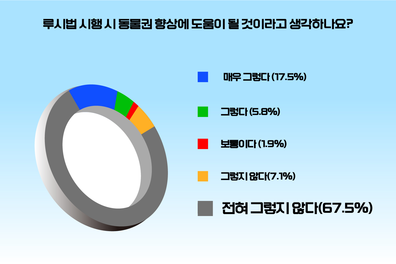 다음으로 '루시법 시행 시 동물권 향상에 도움이 될 것이라고 생각하나요'라는 질문에 '전혀 그렇지 않다'는 의견이 67.5%로 가장 많았습니다. 이어 '매우 그렇다' 17.5%, '그렇지 않다' 7.1%, '그렇다' 5.8%, '보통이다' 1.9% 순으로 나타났습니다.