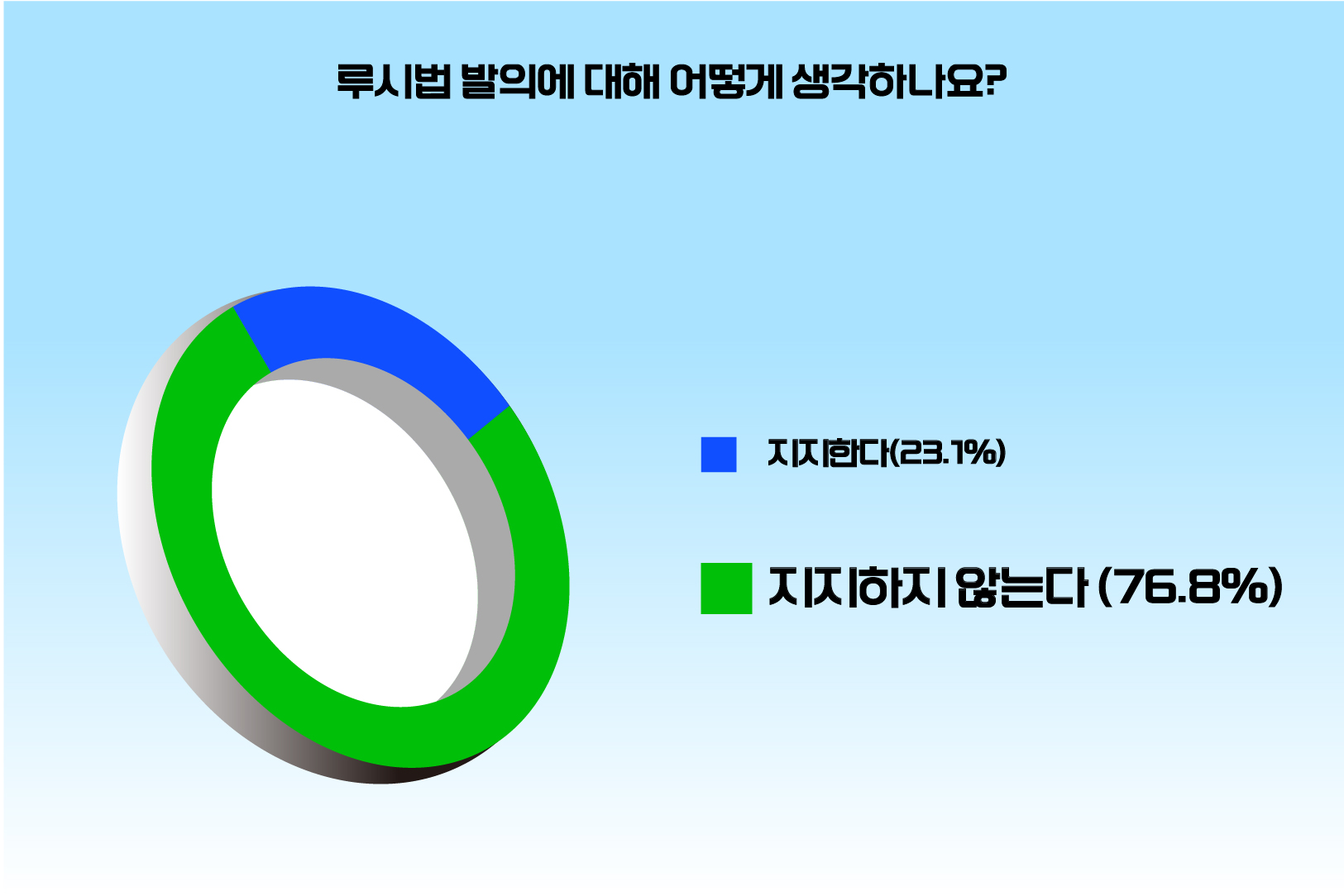 우선 '루시법 발의에 대해 어떻게 생각하나요'라는 질문에 '지지하지 않는다'는 의견이 76.8%로 가장 높은 비율을 차지했습니다. '지지하지 않는다'는 23.1%로 나타났습니다.