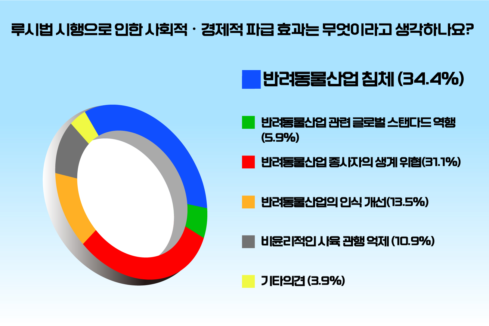 마지막으로 '루시법 시행으로 인한 사회적ㆍ경제적 파급 효과는 무엇이라고 생각하나요'라는 질문에 '반려동물산업 침체'를 선택한 비율이 34.4%로 가장 높았습니다. 그 다음으로 '반려동물산업 종사자의 생계 위협' 31.1%, '반려동물산업의 인식 개선' 13.5%, '비윤리적인 사육 관행 억제' 10.9%, '반려동물산업 관련 글로벌 스탠다드 역행' 5.9%, '기타의견' 3.9%로 집계됐습니다.