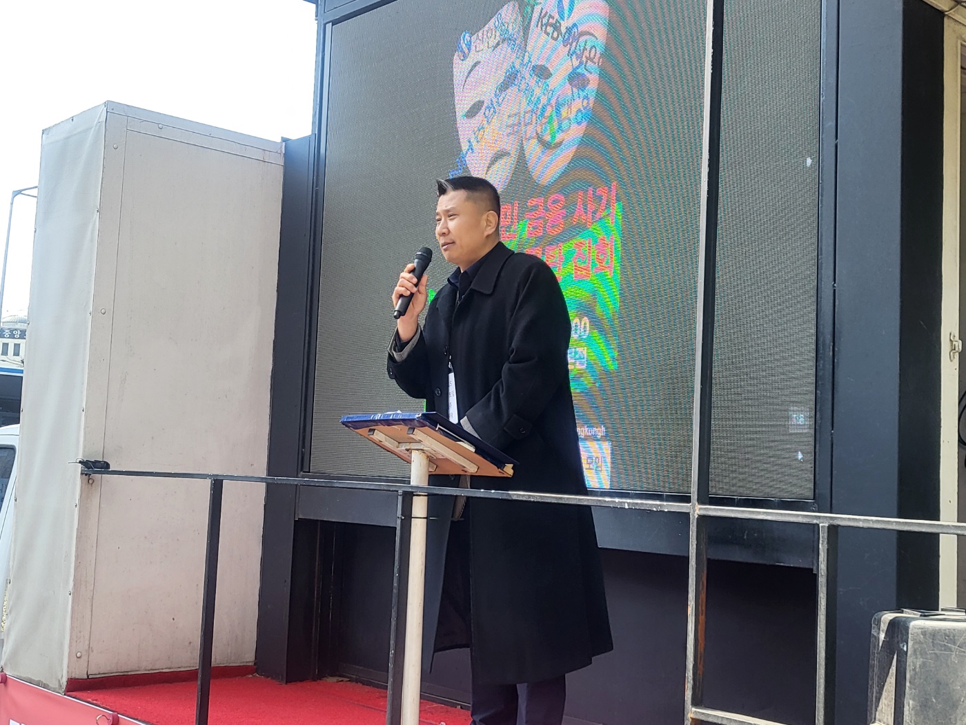 길성주 홍콩 ELS 피해자 모임 위원장이 15일 서울서대문 농협 본점 앞에서 '대국민 금융 사기 계약 원천 무효' 집회에서 입장문을 발표하고 있다. 출처=위즈경제