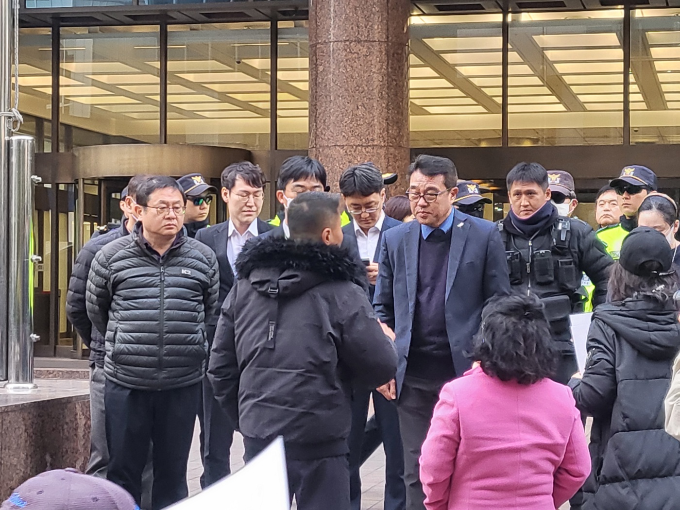 홍콩지수 ELS피해자모임 단체가 기자회견이 끝난 뒤 이복현 금감원장과 은행장 간담회 배석을 요구하며 은행연합회 건물 진입을 시도했지만 은행연합회 관계자와 경찰에 의해 저지당하고 있다. 출처=위즈경제