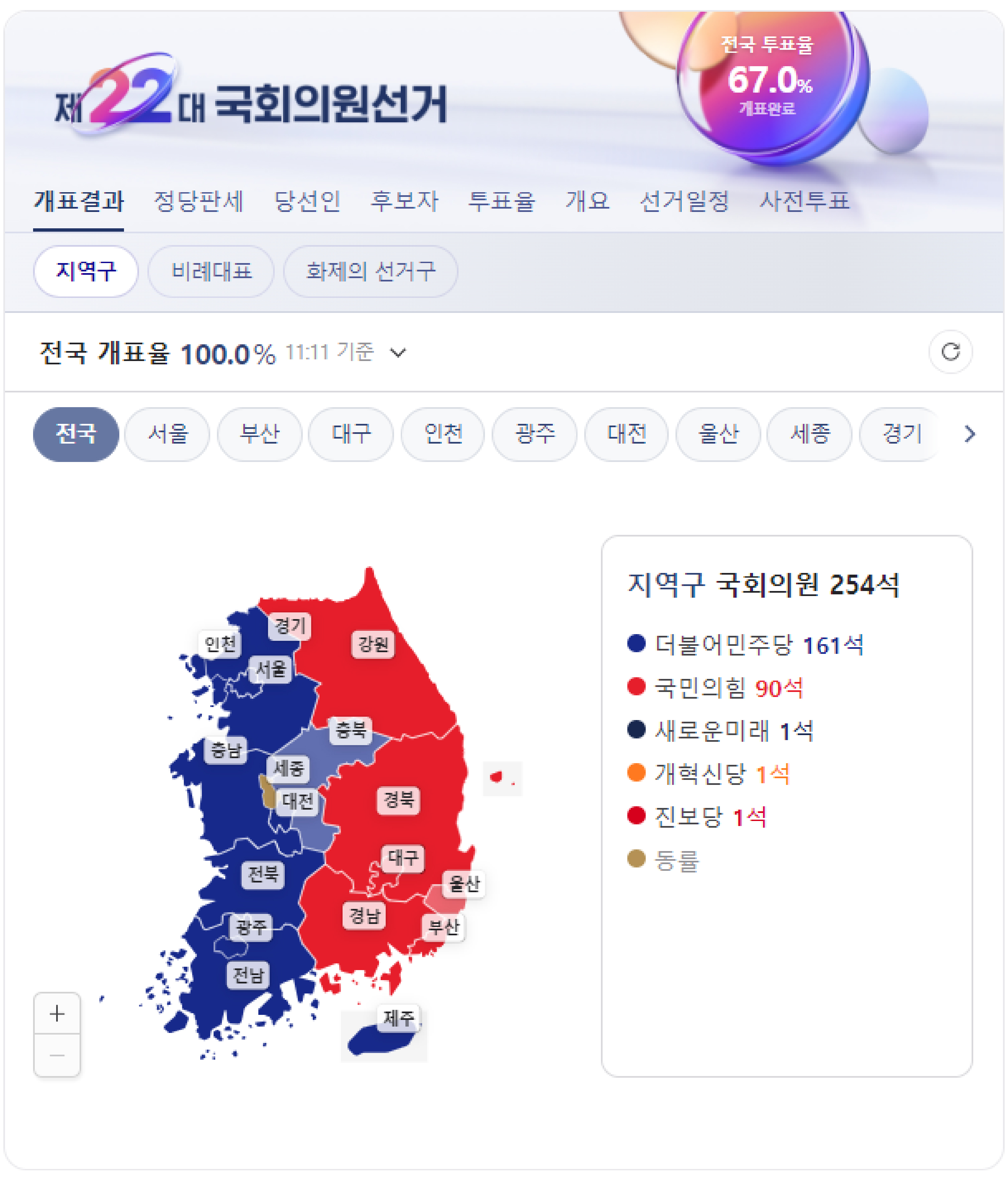 11일 중앙선거관리위원회(중앙선관위) 개표 상황에 따르면 더불어민주당 161석, 국민의힘 90석, 새로운미래, 개혁신당, 진보당은 각각 1석씩