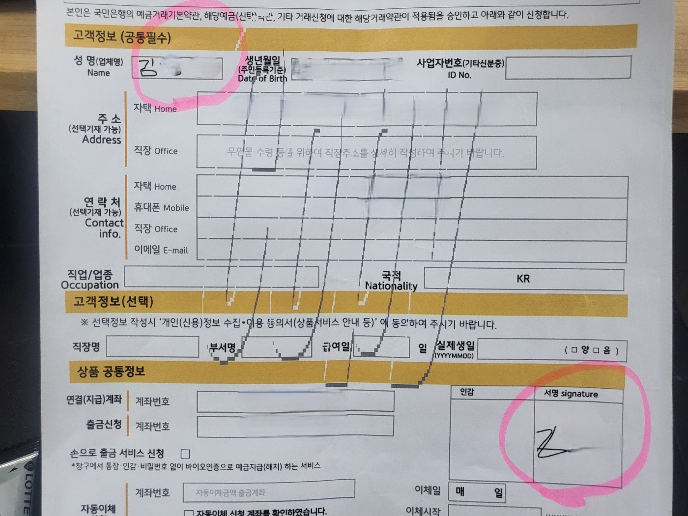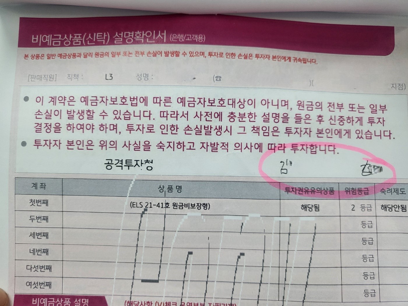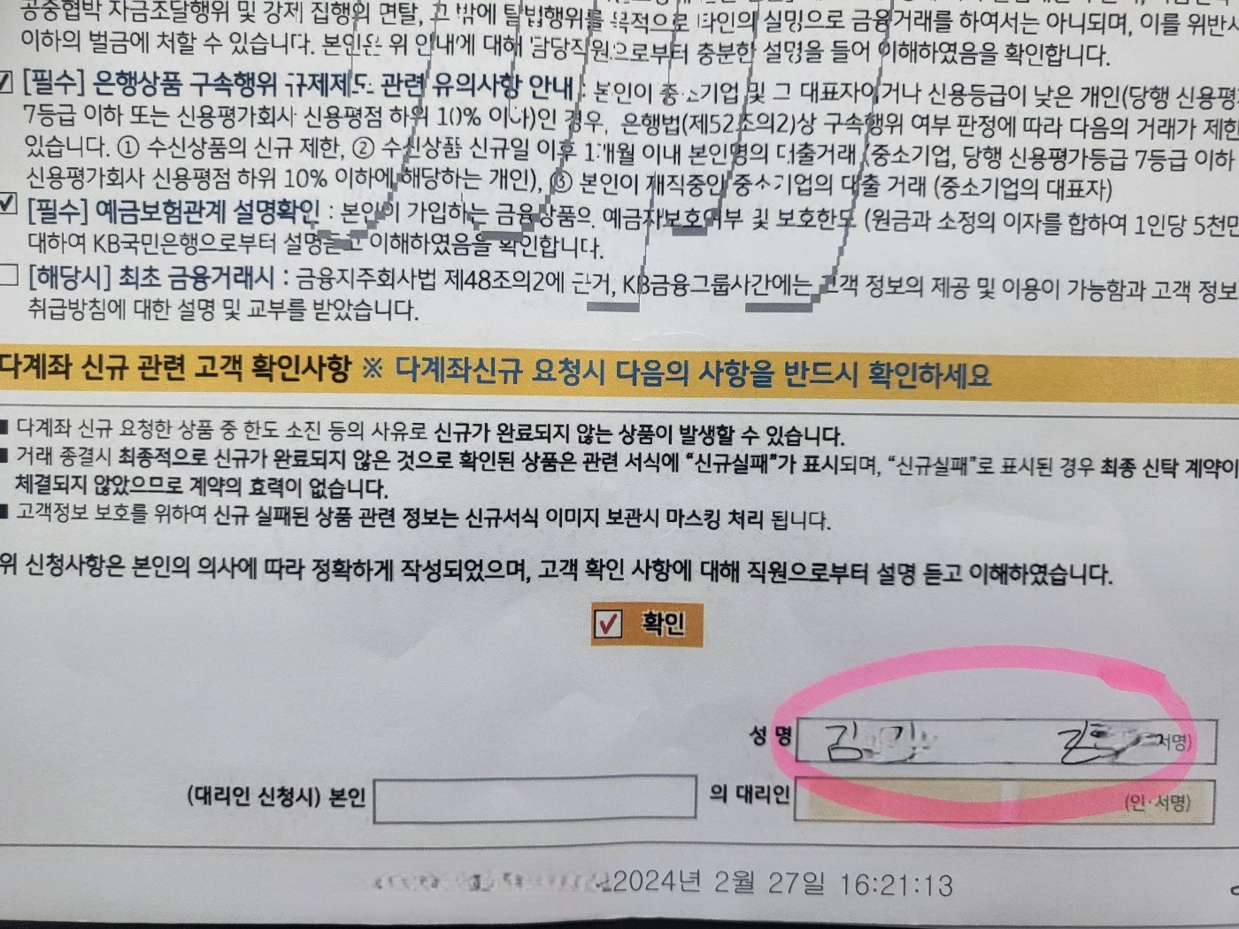 이 씨는 아내가 당시 계약서(다계좌 신규용 신탁 신규거래신청서) 첫 장에 있는 고객정보의 성명과 상품 공통정보의 서명란에 표기된 사인이 모든 페이지에 일괄 서명으로 처리되어 있는 점을 지적했습니다.