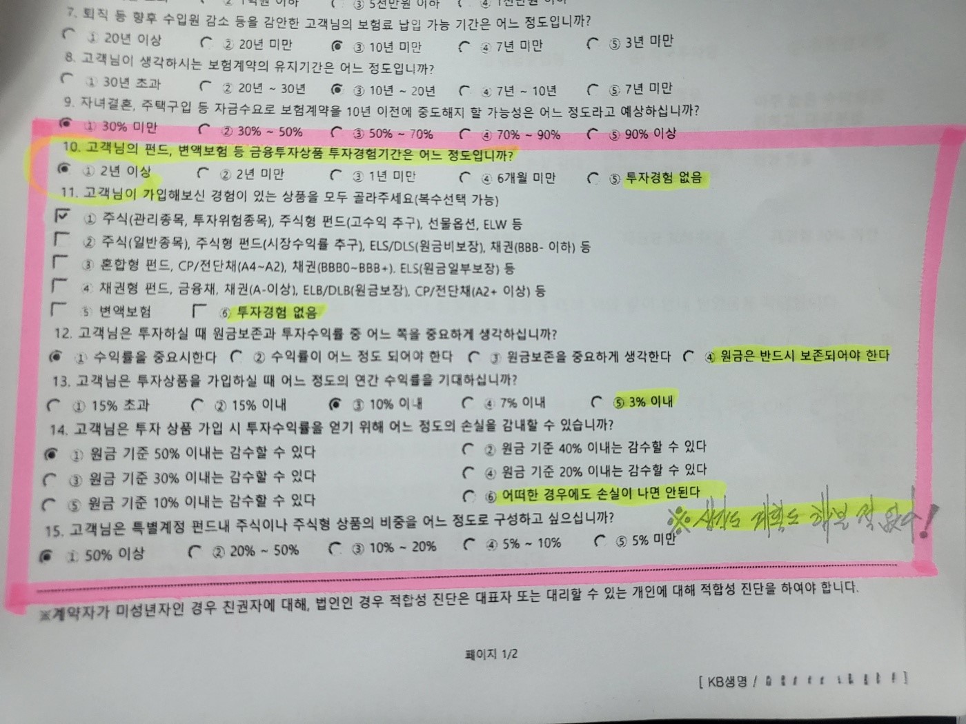 이 씨가 공개한 변액보함 가입자 적합성 진단표. 이 씨의 아내는 투자경험이 없지만 10번 문항에 '2년 이상'으로 체크되어 있다. 이외에도 15번 문항까지 상식적으로 이해할 수 없는 항목에 표시되어 있다는 것이 이 씨의 주장이다. 출처=위즈경제
