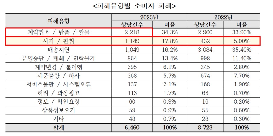 [위즈경제] 김영진 기자 = 지난해 서울시전자상거래센터에는 총 6,460건의 피해 상담이 접수되었습니다. 2022년 8,723건 보다는 26% 가량 감소하긴 했으나, ‘사기·편취 피해’가 1,149건으로 2.7배, ‘예매 및 예약서비스 피해가 364건으로 2.4배 늘어났습니다.