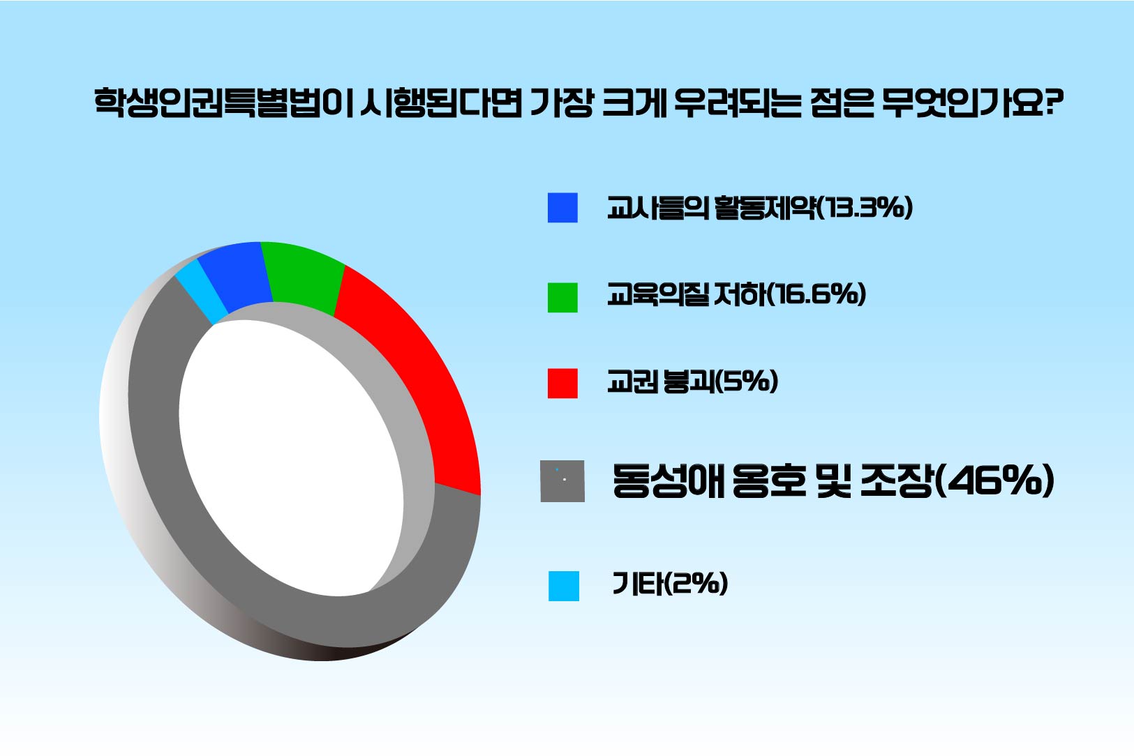 이어 '학생인권특별법이 시행된다면 가장 크게 우려되는 점은 무엇인가요?라는 질문에는 '동성애 옹호·조장'이 46%를 차지했습니다. 이어 '교권붕괴'(15.9%), '교육의 질 저하'(5.9%), '교사들의 교육활동 제약'(4.8%), '기타'(2%) 순입니다.