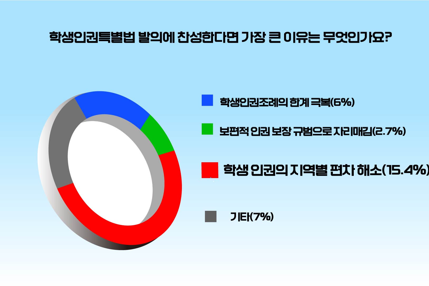 이어 '학생인권특별법 발의에 찬성한다면 가장 큰 이유는 무엇인가요?라는 질문에는 '학생 인권의 지역별 편차해소'가 15.4%를 차지했습니다. 이어 '기타'(7%), '학생인권조례의 한계 극복'(6%), '보편적 인권 보장 규범으로 자리매김'(2.7%) 순입니다.