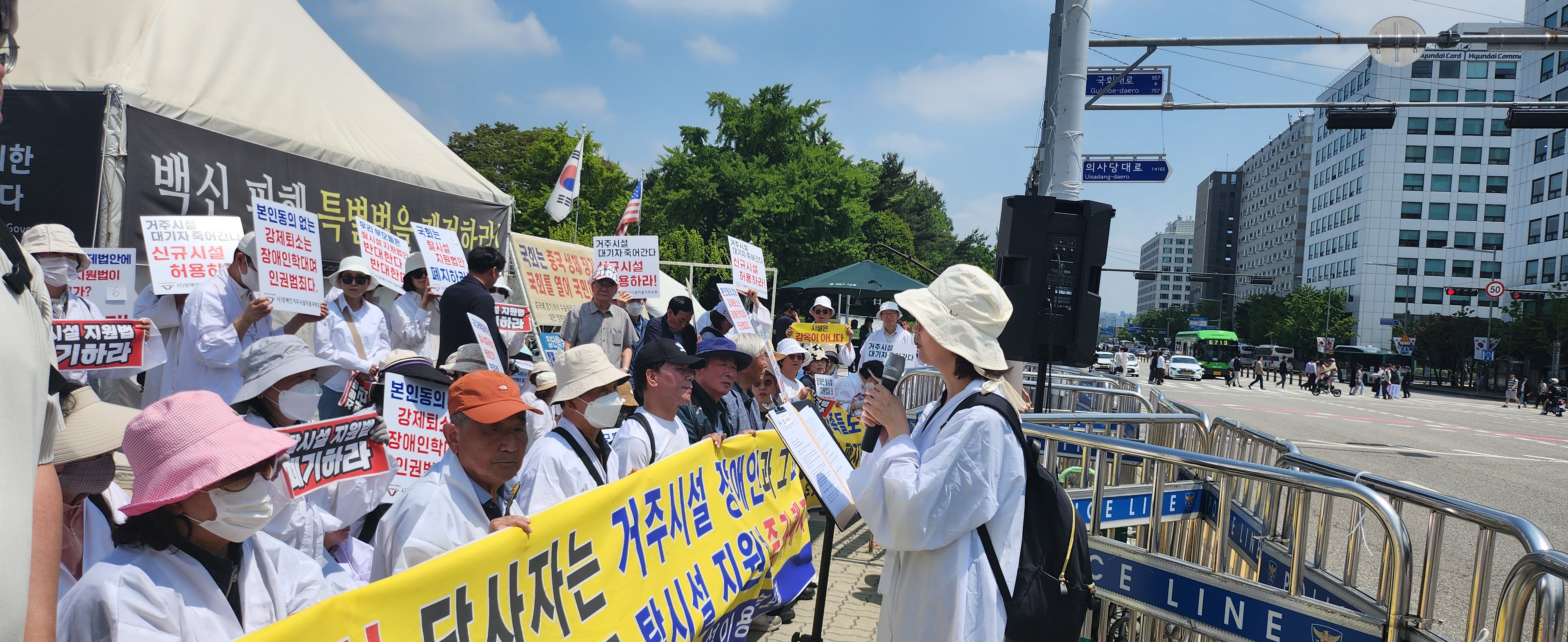 21일 오전 국회의사당 앞에서 열린 시위에서 부모회는 “2022년 6월에는 임기가 한 달도 남지 않은 시의원들이 도둑처럼 ‘서울시 탈시설지원조례’를 통과시키더니, 지금도 똑같이 21대 국회가 보름도 안 남은 시점에서 보건복지부와 여야가 ‘탈시설’ 글자만 지운 ‘탈시설법안’을 다시 통과시키겠다고 으름장을 놓고 있으니 부모들의 가슴이 타들어 가고 있다”고 전했습니다.