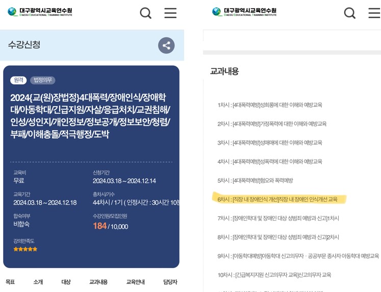 법정의무연수란 법령 또는 지침에 따라 교원과 교육전문직에 종사하는 사람이 의무적으로 수행해야 하는 연수를 지칭합니다. 교과내용은 총 11개로 이뤄져 있으며, 직장 내 장애인 인식개선 교육은 매년 1시간 이상 들어야 하는 과목입니다.