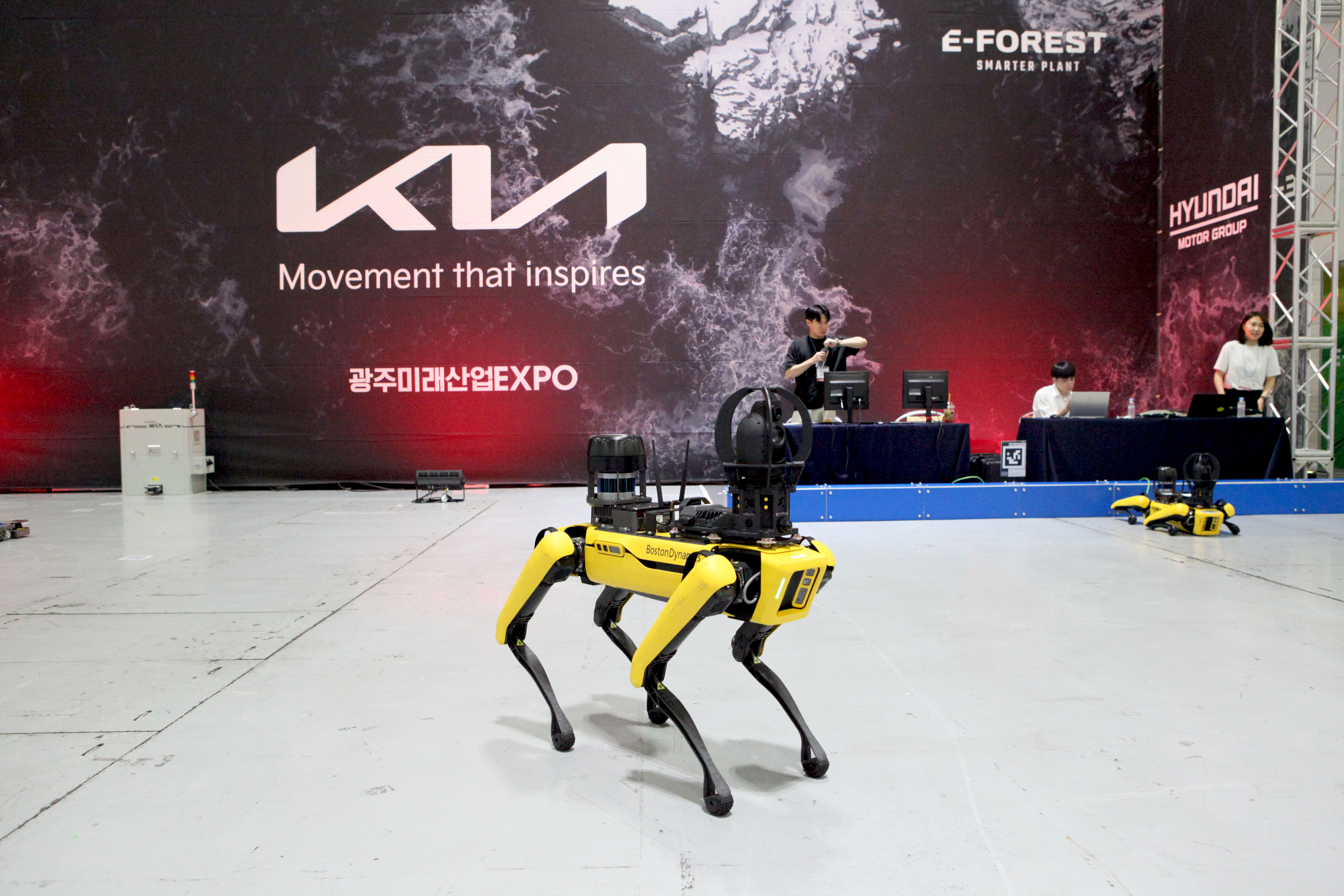 현대자동차그룹 테크관에서 시연 중인 보스턴 다이나믹스의 로봇개 스팟(SPOT) 전체 모습(출처=위즈경제)