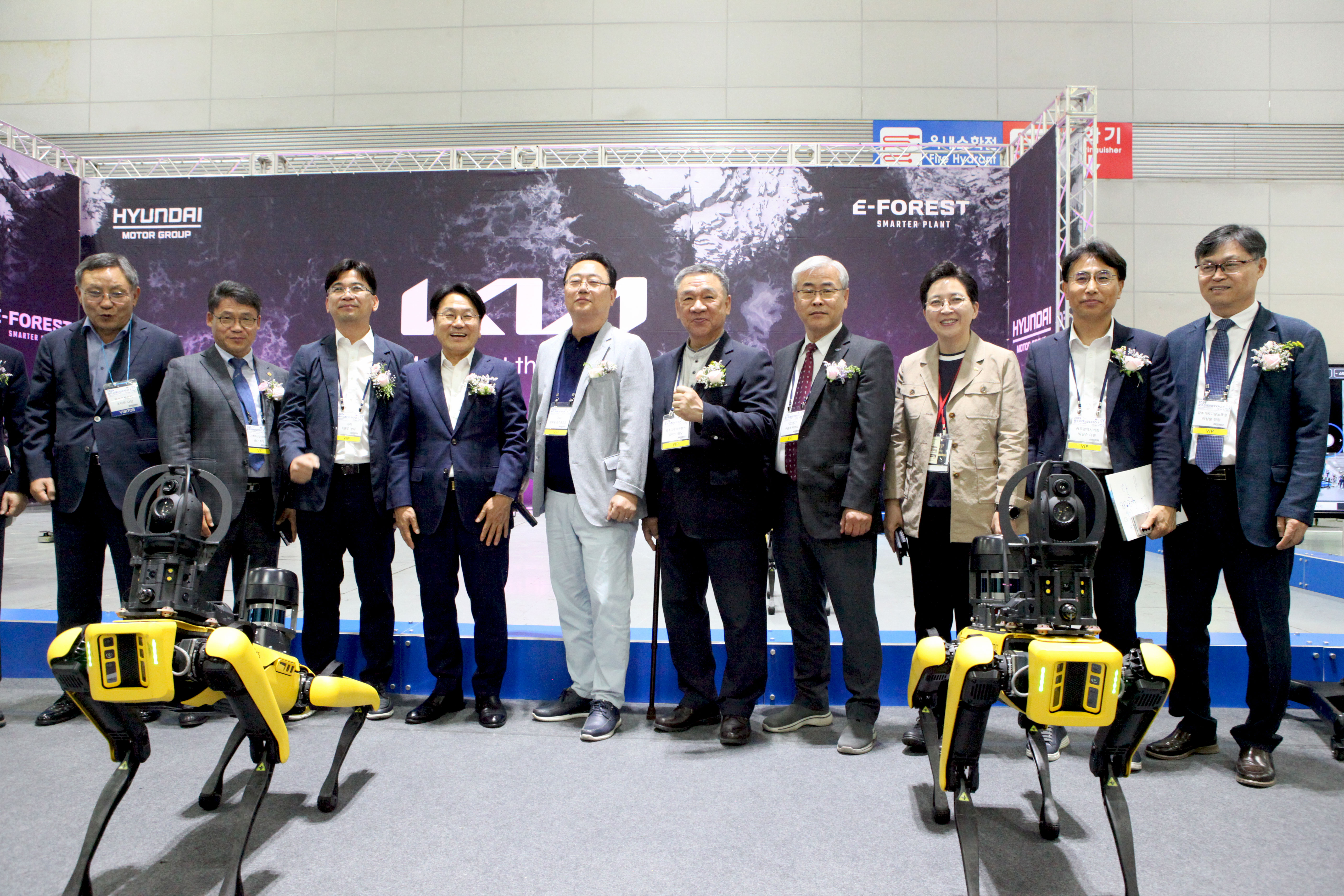 현대자동차그룹 테크관을 찾아 보스턴 다이나믹스의 로봇개 스팟(SPOT)와 기념 촬영 중인 강기정 광주광역시 시장(출처=위즈경제)