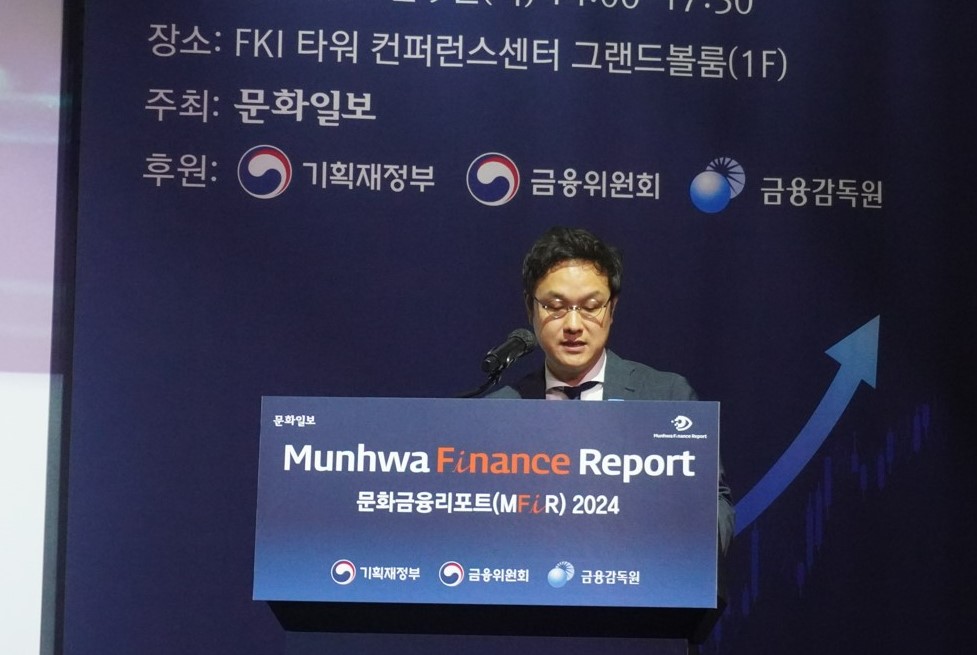 박영호 보스턴컨설팅그룹코리아 매니징디렉터 파트너가 9일 서울 여의도 KFI 타워 컨퍼런스센터 그랜드블룸 1층에서 열린 '제5회 문화금융리포트 2024'에 참석해 '기술 발전에 따른 금융플랫폼 전략의 미래'를 주제로 발표하고 있다. 사진=위즈경제