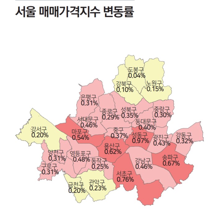 따르면, 서울매매가격지수 변동률은 서초구가 0.76%로 강남