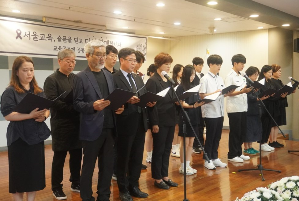 18일 오후 서울시교육청에서 열린 서이초 교사 순직 1주기 공동 추모식에서 학생,학부모,교원 대표가 공동 선언을 하고 있다. 사진=위즈경제