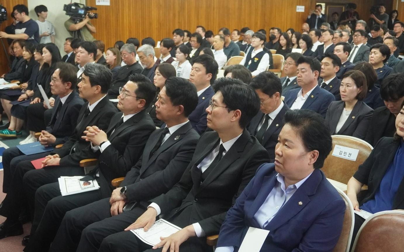 18일 서이초 1주기를 맞아 서울시교육청과 6개 교원단체, 교사유가족협의가 공동주관으로 주관한 추모식에 참석한 참석자들이 개회사를 듣고 있다. 사진=위즈경제